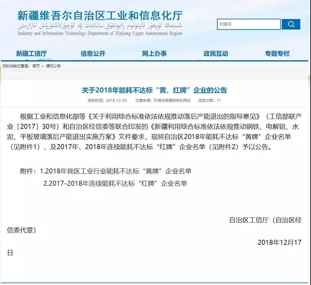 日前,新疆維吾爾自治區(qū)工信廳發(fā)布了《關(guān)于2018年能耗不達(dá)標(biāo)“黃、紅牌”企業(yè)的公告》公告文件稱,根據(jù)工信部等《關(guān)于利用綜合標(biāo)準(zhǔn)依法依規(guī)推動落后產(chǎn)能退出的指導(dǎo)意見》(工信部聯(lián)產(chǎn)業(yè)〔2017〕30號)和新疆維吾爾自治區(qū)經(jīng)信委等聯(lián)合印發(fā)的《新疆利用綜合標(biāo)準(zhǔn)依法依規(guī)推動鋼鐵、電解鋁、水泥、平板玻璃落后產(chǎn)能退出實施方案》文件要求,將自治區(qū)2018年能耗不達(dá)標(biāo)“黃牌”企業(yè)名單及2017年、2018年連續(xù)能耗不達(dá)標(biāo)“紅牌”企業(yè)名單予以公告。名單中包括三家水泥企業(yè)分別為:2018年新疆區(qū)工業(yè)行業(yè)能耗不達(dá)標(biāo)“黃牌”水泥企業(yè)名單為新疆和靜天山水泥有限責(zé)任公司。2017-2018年新疆區(qū)工業(yè)行業(yè)能耗連續(xù)不達(dá)標(biāo)“紅牌”水泥企業(yè)3家,分別為精河縣昆侖水泥有限公司、皮山杜瓦玉山水泥有限責(zé)任公司和田魯新建材有限公司