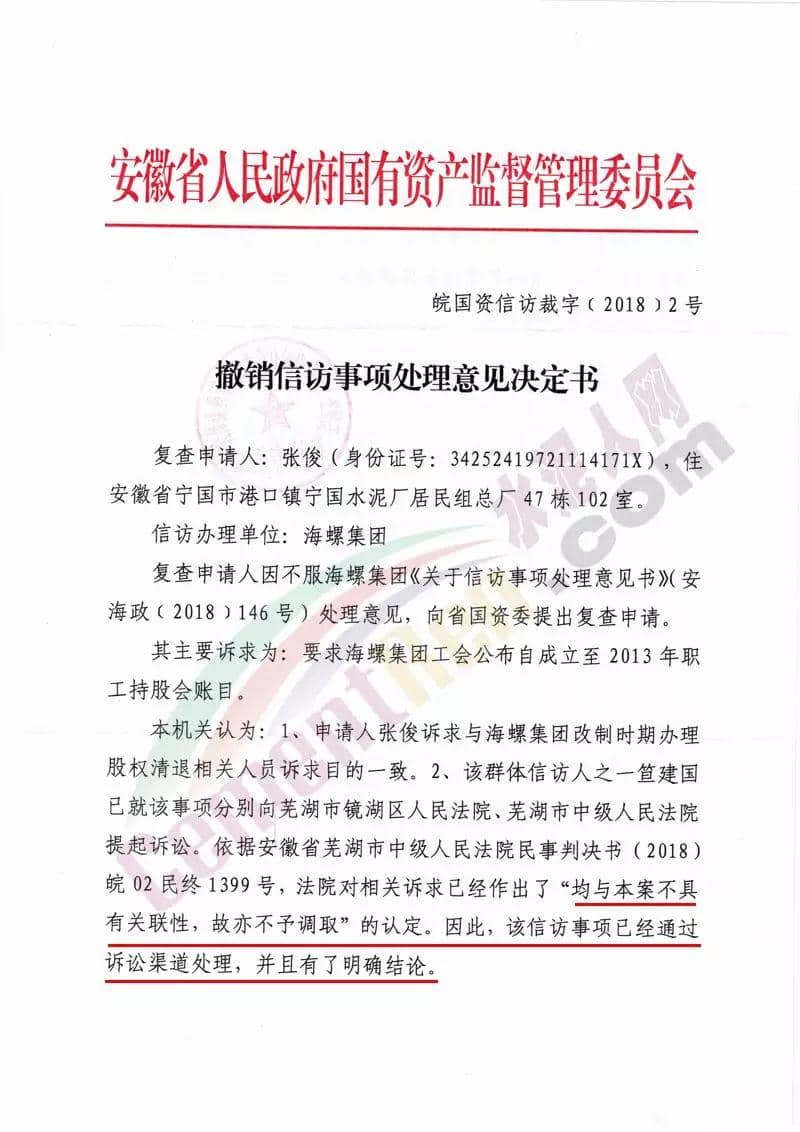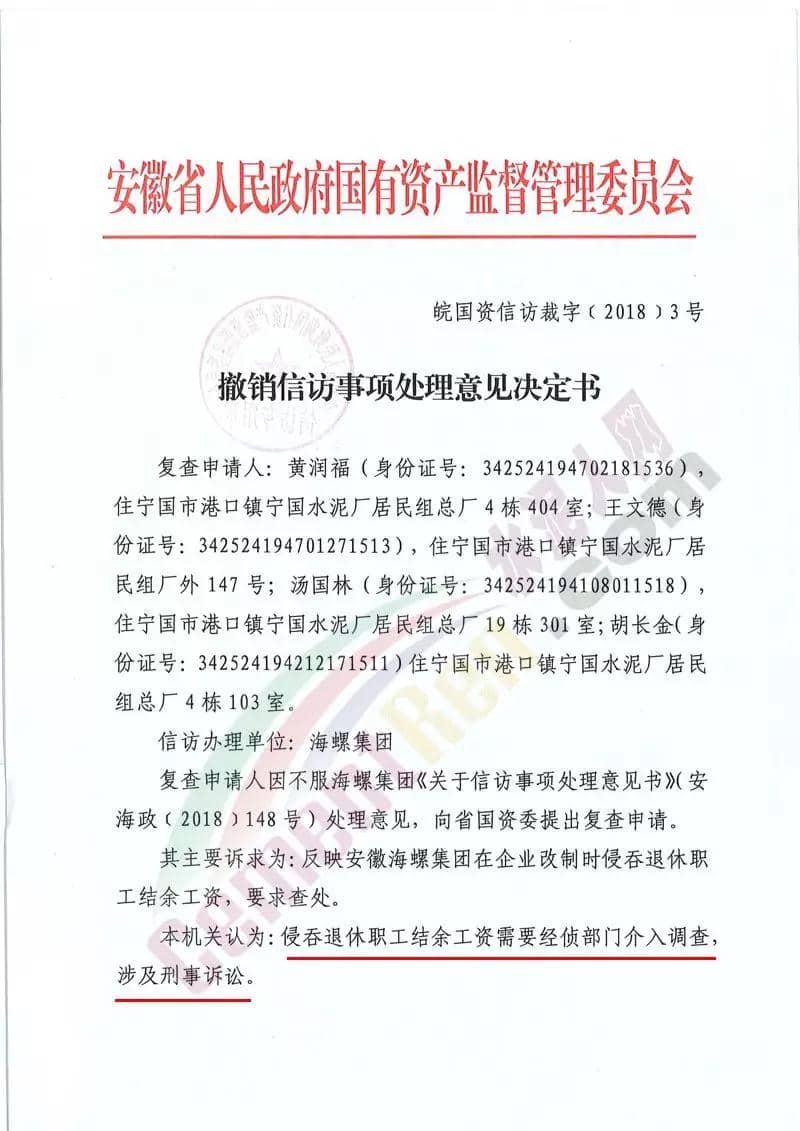 同期,安徽省人民政府國有資產(chǎn)監(jiān)督管理委員會(huì)發(fā)布了《撤銷信訪事項(xiàng)處理意見決定書》(皖國資信訪裁字【2018】3號(hào))文件。文件稱,針對相關(guān)人員反映海螺集團(tuán)在企業(yè)改制時(shí)侵吞退休職工結(jié)余工資一事。需要經(jīng)偵部門介入調(diào)查,涉及刑事訴訟。按照國務(wù)院《信訪條例》相關(guān)條款規(guī)定,撤銷海螺集團(tuán)《關(guān)于信訪事項(xiàng)處理意見書》(安海政【2018】148號(hào))處理意見。請海螺集團(tuán)引導(dǎo)信訪人通過其他法定途徑反映訴求。文件原文如下: