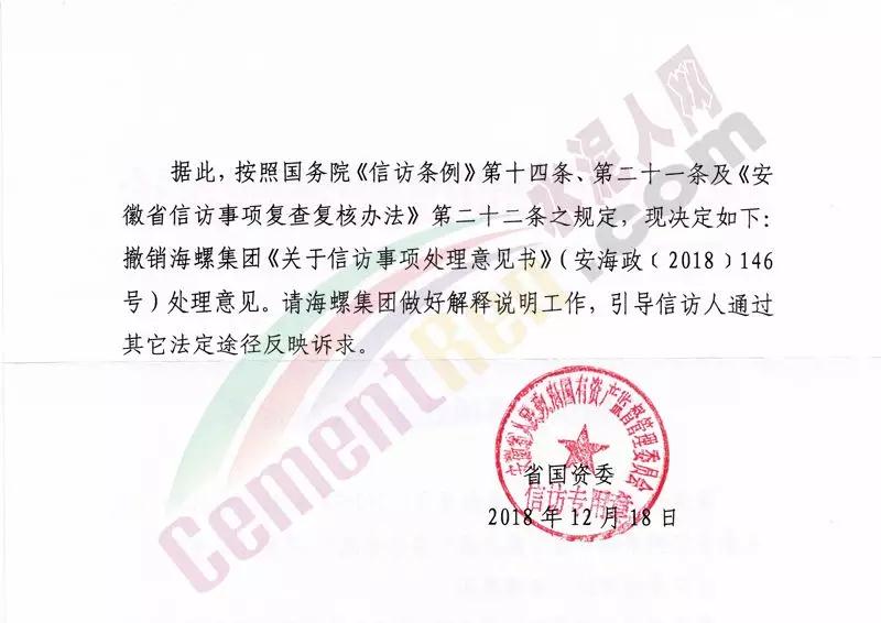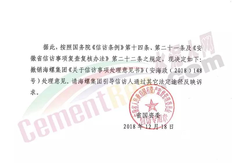 日前,安徽省人民政府國有資產(chǎn)監(jiān)督管理委員會(huì)發(fā)布《撤銷信訪事項(xiàng)處理意見決定書》(皖國資信訪裁字【2018】2號(hào))文件。文件稱,信訪事項(xiàng)已經(jīng)通過訴訟渠道處理,并且有了明確結(jié)論。按照國務(wù)院《信訪條例》相關(guān)條款決定撤銷海螺集團(tuán)《關(guān)于信訪事項(xiàng)處理意見書》(安海政【2018】146號(hào))處理意見。請海螺集團(tuán)做好解釋說明工作,引導(dǎo)信訪人通過其他法定途徑反映訴求。文件原文如下: