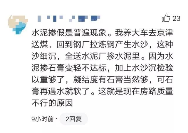 1、有網(wǎng)友說:水泥摻假是普遍現(xiàn)象。我養(yǎng)大車去京津送煤,回到鋼廠拉煉鋼產(chǎn)生水沙,這種沙細沉,全送水泥廠摻水泥里。因為水泥摻石膏變輕不達標,加上水沙沉檢驗以重夠了,凝結(jié)度有石膏當然夠,可石膏再遇水就軟了。這就是現(xiàn)在房路質(zhì)量不行的原因。