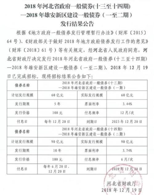 此前,河北省財(cái)政廳發(fā)行的2018年河北省政府一般債券(十三至十四期)、2018年雄安新區(qū)建設(shè)一般債券(一至二期)已于12月19日完成招標(biāo)。