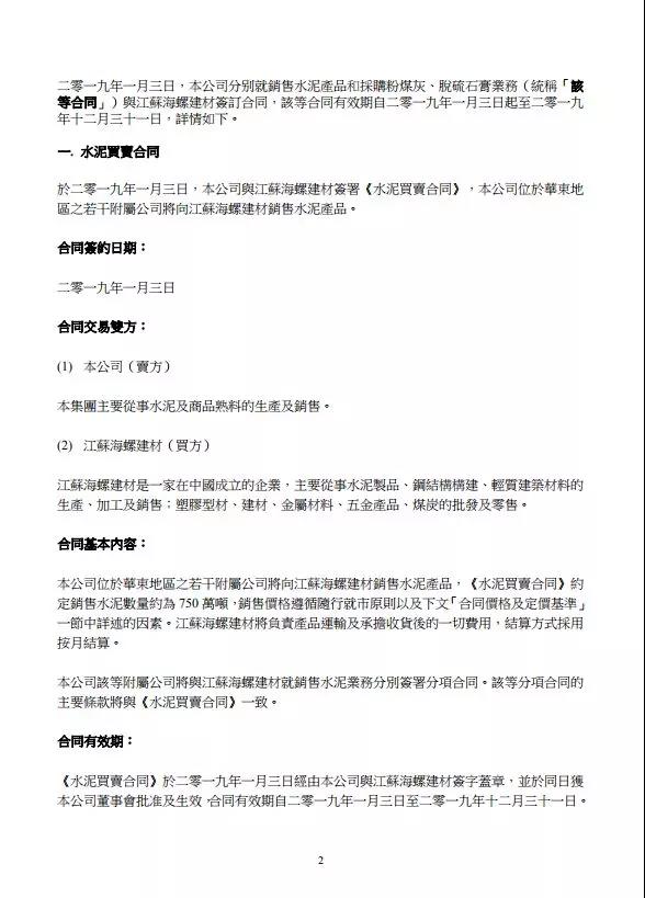 同日,公司與江蘇海螺建材簽署《物資采購合同》,根據(jù)《物資采購合同》,公司位于上海區(qū)域的3家附屬公司將向江蘇海螺建材采購粉煤灰及脫硫石膏,合同有效期自2019年1月3日至2019年12月31日,預(yù)估總交易金額約為不多于人民幣2120萬元。
