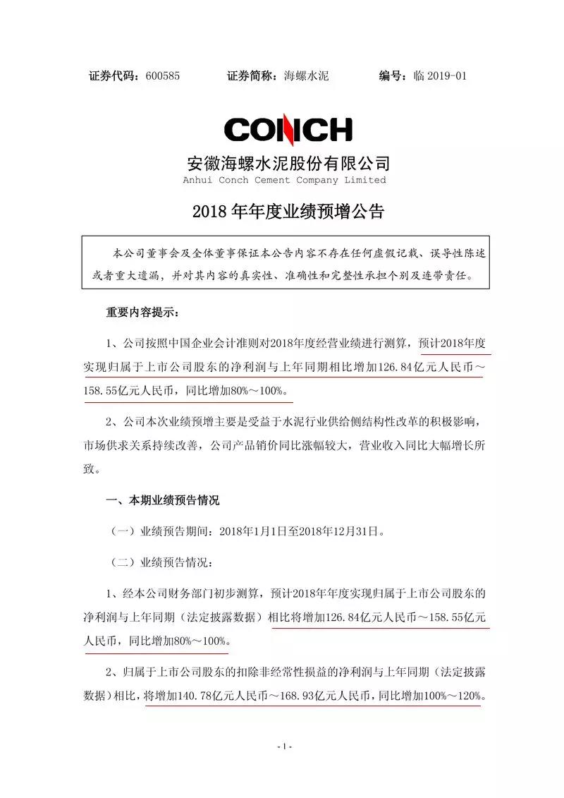 海螺水泥1月10日晚間發(fā)布2018年業(yè)績預(yù)告,預(yù)計公司2018年全年凈利潤為285.39億元~317.10億元,上年同期為158.55億元,同比增長80%~100%。