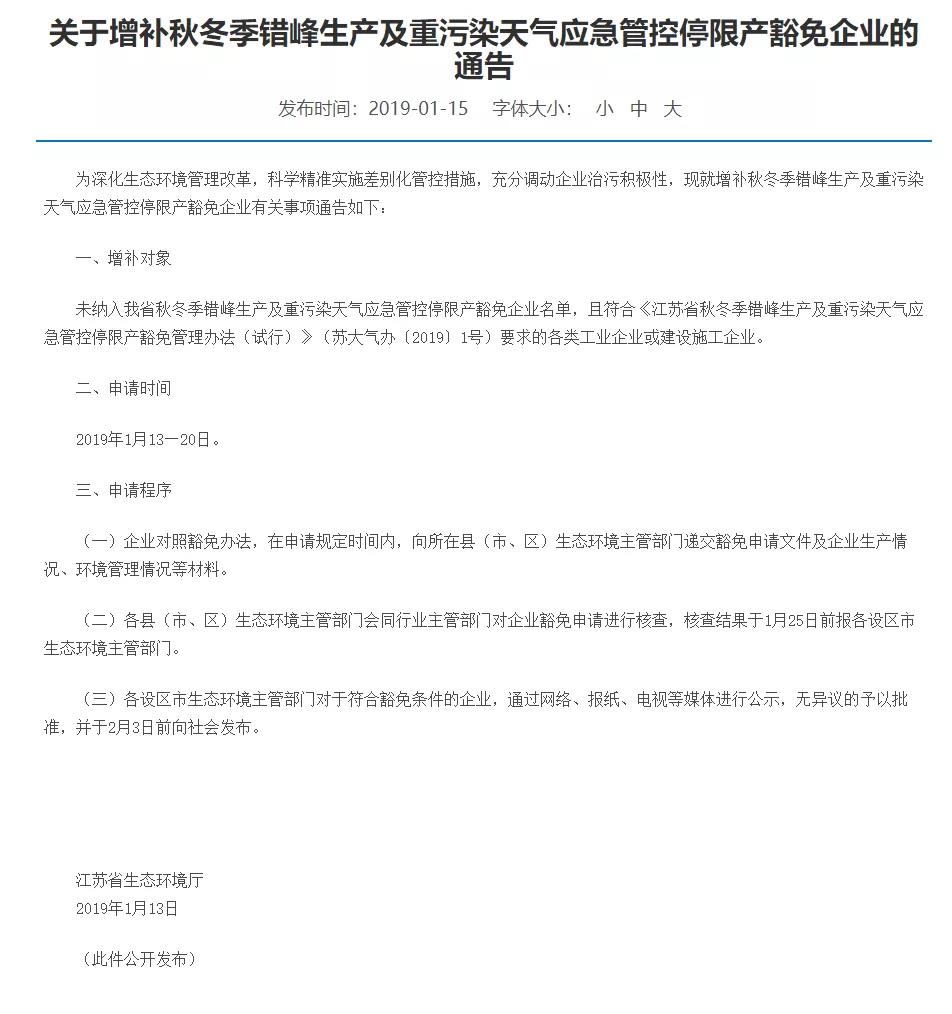 江蘇省生態(tài)環(huán)境廳同期還發(fā)布了《關于增補秋冬季錯峰生產(chǎn)及重污染天氣應急管控停限產(chǎn)豁免企業(yè)的通告》。通告稱為深化生態(tài)環(huán)境管理改革,科學精準實施差別化管控措施,充分調(diào)動企業(yè)治污積極性,就增補秋冬季錯峰生產(chǎn)及重污染天氣應急管控停限產(chǎn)豁免企業(yè)有關事項通告如下: