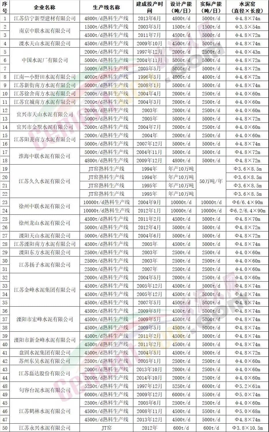 備注:上述數(shù)據(jù)來源于水泥人網(wǎng)信息中心數(shù)據(jù)庫,截止2017年12月31日位于江蘇省鎮(zhèn)江市潤州區(qū)韋崗街道的江蘇聯(lián)合水泥有限公司的6000t/d熟料生產(chǎn)線(Φ5.2×61m水泥窯)已按100萬噸/年產(chǎn)能公告,用于產(chǎn)能置換 。