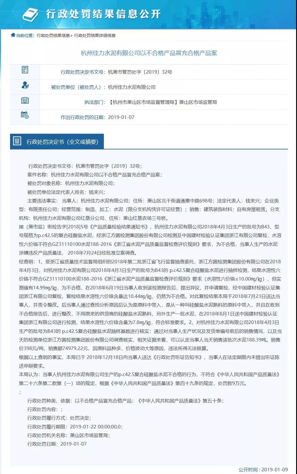蕭山區(qū)市場監(jiān)管局認為:當事人杭州佳力水泥有限公司生產的p.c42.5復合硅酸鹽水泥不合格的行為,不符合《中華人民共和國產品質量法》第二十六條第二款第(一)項的規(guī)定,根據(jù)《中華人民共和國產品質量法》第四十九條的規(guī)定,處罰款9萬元。行政處罰決定書原文如下: