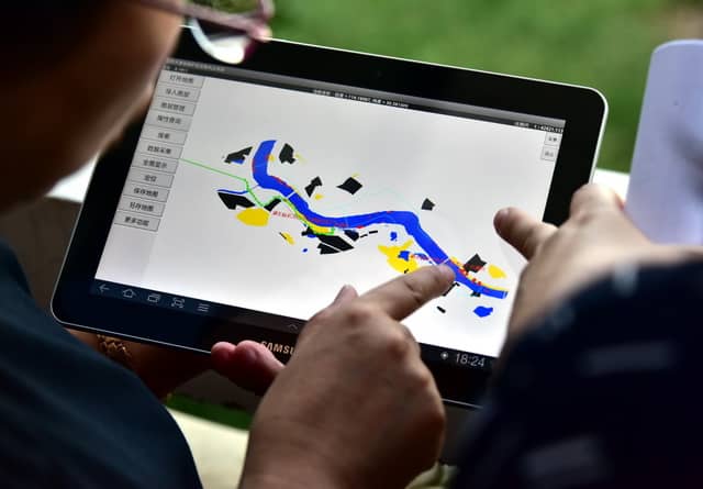 2017年9月7日,原環(huán)境保護(hù)部組織的長(zhǎng)江經(jīng)濟(jì)帶飲用水水源地環(huán)境保護(hù)執(zhí)法專項(xiàng)行動(dòng)第一督查組在湖北武漢督查。圖為督查人員通過飲用水水源保護(hù)區(qū)現(xiàn)場(chǎng)巡查衛(wèi)星遙感支持系統(tǒng)在現(xiàn)場(chǎng)檢查。攝影/章軻