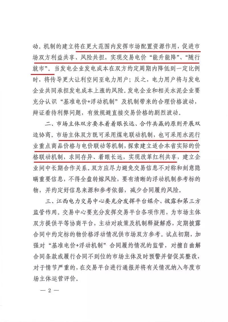 三、江西電力交易中心要充分發(fā)揮平臺媒介、披露和第三方監(jiān)管作用。交易中心要充分發(fā)揮交易平臺各項作用,為市場主體雙方提供平等協(xié)商平臺,主動對政策及機制釋疑解惑,定期披露合同中約定標的物價格浮動情況從市場雙方參考。試點初期,加強對"基準電價+浮動機制”合同履約情況的監(jiān)管,對擅自曲解合同條款或改造合同不到位的市場主體及時預警并督促其整改,對于情節(jié)嚴重的,在交易平臺進行通報并將有關情況納入年度市場運營評價。文件原文如下