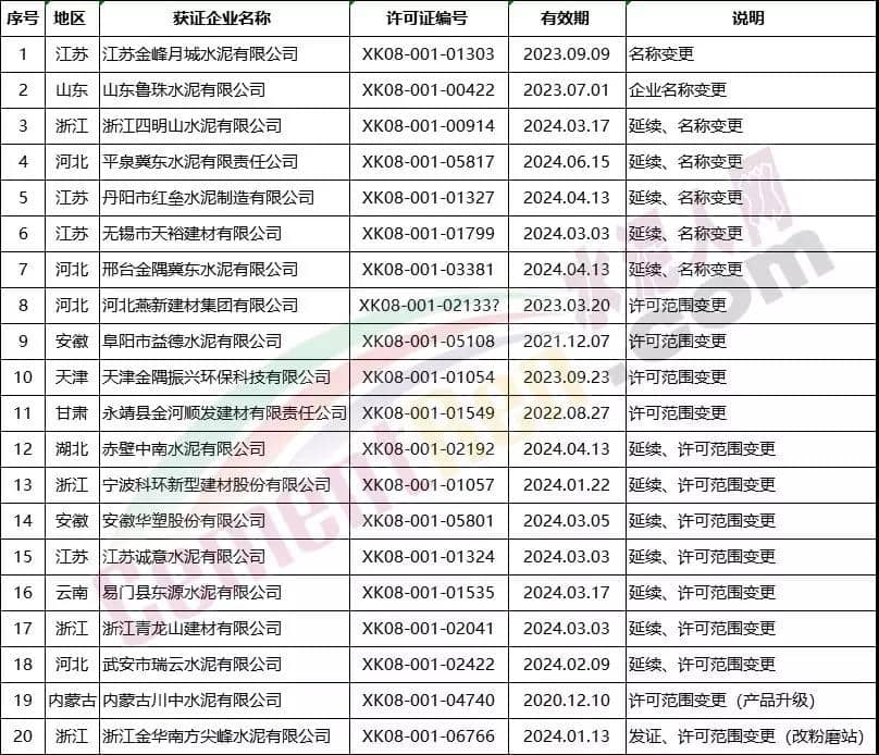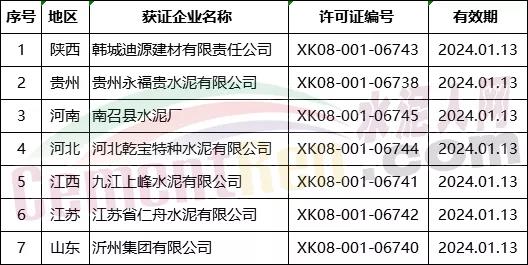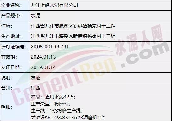 本期發(fā)放的水泥企業(yè)生產(chǎn)許可證涉及海螺水泥、南方水泥、金隅冀東、山水水泥、蒙西水泥、萬(wàn)年青水泥、亞泰水泥、亞?wèn)|水泥、上峰水泥等企業(yè)及其子公司。其中九江上峰水泥有限公司為新發(fā)證書(shū)。