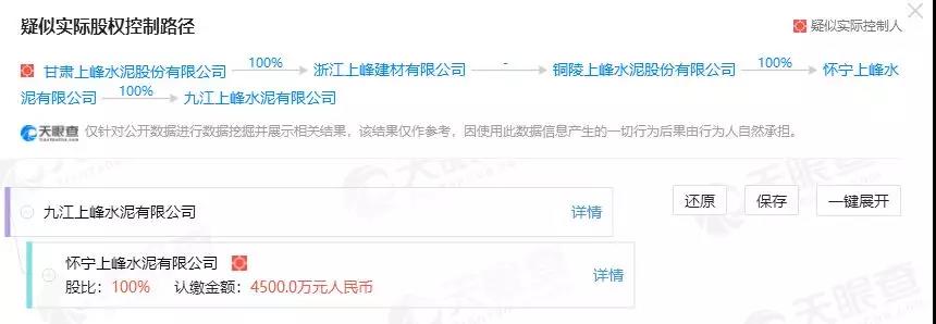 天眼查數(shù)據(jù)顯示,九江上峰水泥有限公司為懷寧上峰水泥公司全資控股子公司。企業(yè)在2018年3月28日,由九江市盤石水泥有限公司變更為九江上峰水泥有限公司。據(jù)水泥人網(wǎng)了解這家企業(yè)是懷寧上峰水泥以一元人民幣收購(gòu)而來(lái)。