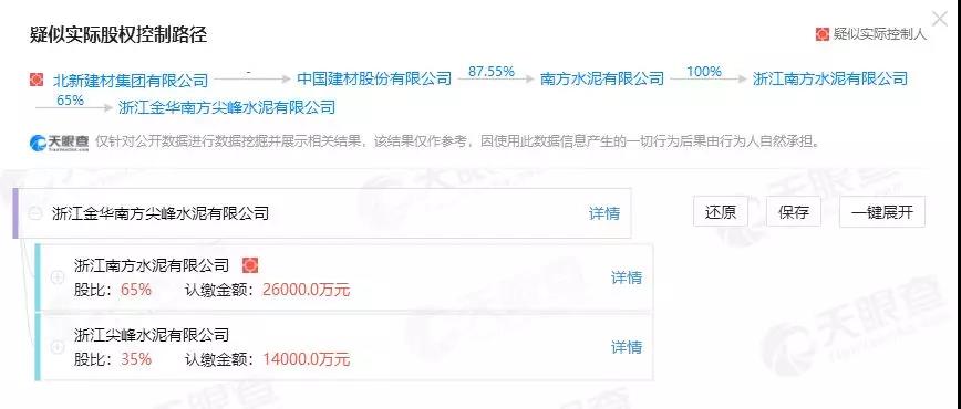 天眼查數(shù)據(jù)顯示,浙江金華南方尖峰水泥有限公司為浙江南方水泥有限公司和浙江尖峰水泥有限公司合資公司。其中中國(guó)建材股份有限公司旗下浙江南方水泥有限公司股比65%為第一大股東,浙江尖峰水泥有限公司股比35%