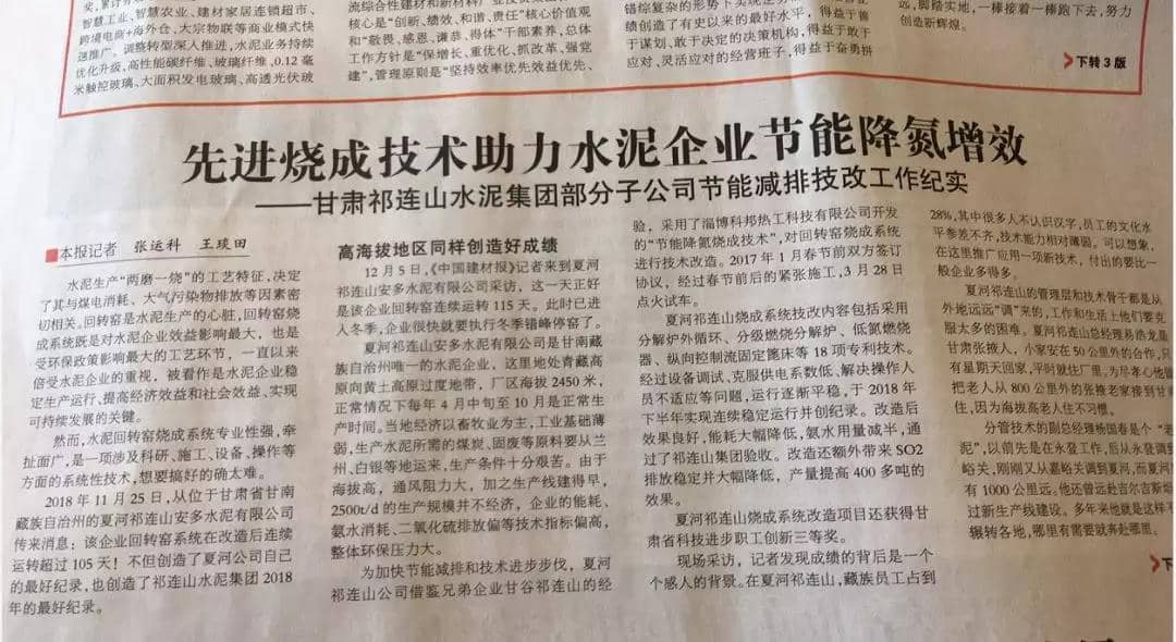 祁連山水泥集團內(nèi)部最早采用淄博科邦“節(jié)能降氮先進燒成技術(shù)”的并不是夏河公司,而是位于天水市的甘谷祁連山水泥有限公司,2016年3月15日即完成技改點火。