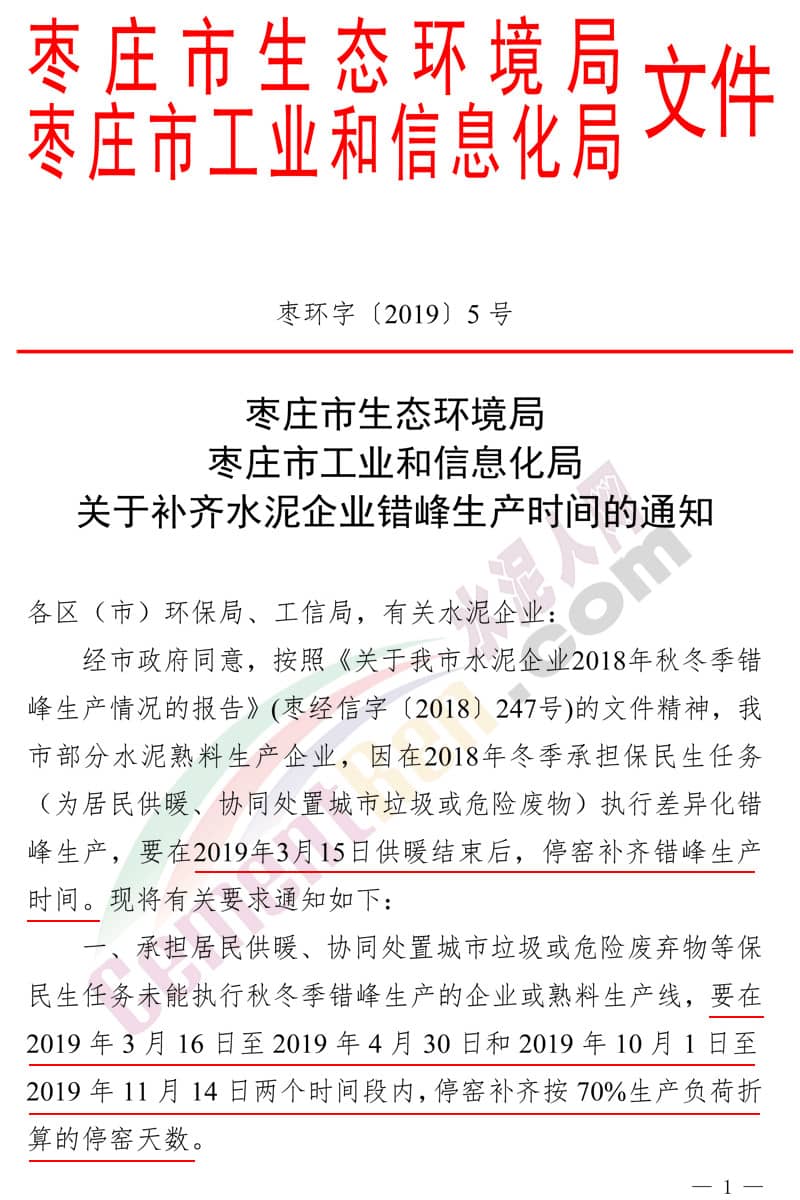 日前,棗莊市生態(tài)環(huán)境局及棗莊市工業(yè)和信息化局聯(lián)合發(fā)布《關(guān)于補(bǔ)齊水泥企業(yè)錯峰生產(chǎn)時間的通知》,要求在2018年冬季承擔(dān)居民供暖、協(xié)同處置城市垃圾或危險廢棄物等保民生任務(wù)未能執(zhí)行秋冬季錯峰生產(chǎn)的企業(yè)或熟料生產(chǎn)線,要在2019年3月16日至2019年4月30日和2019年10月1日至2019年11月14日兩個時間段內(nèi),停窯補(bǔ)齊按70%生產(chǎn)負(fù)荷折算的停窯天數(shù)。