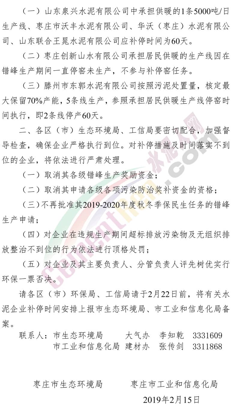 (一)山東泉興水泥有限公司中承擔(dān)供暖的1條5000噸/日生產(chǎn)線、棗莊市沃豐水泥有限公司、華沃(棗莊)水泥有限公司、山東聯(lián)合王晁水泥有限公司應(yīng)補(bǔ)停時間為60天。