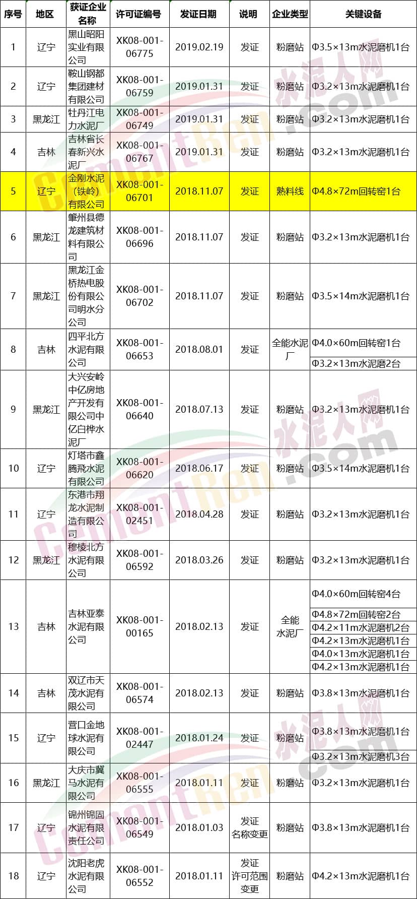 據(jù)查詢,遼寧,吉林,黑龍江從2018年1月至今一共新領(lǐng)生產(chǎn)許可證18個(gè)編號(hào)。其中除吉林亞泰水泥有限公司外和金剛水泥(鐵嶺)有限公司關(guān)鍵設(shè)備包含回轉(zhuǎn)窯設(shè)備,其余全部為水泥磨機(jī)。按照2018年1月1日起開(kāi)始施行的《水泥玻璃行業(yè)產(chǎn)能置換實(shí)施辦法》計(jì)算金剛水泥(鐵嶺)有限公司Φ4.8×72m回轉(zhuǎn)窯設(shè)計(jì)產(chǎn)能為5000t/d熟料生產(chǎn)線。