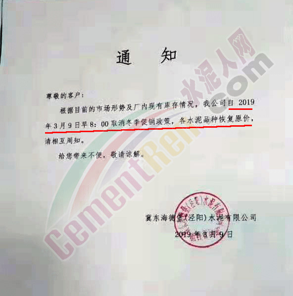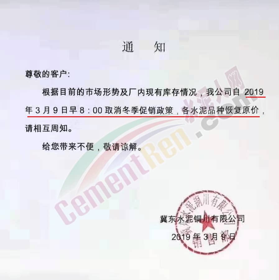 冀東水泥銅川有限公司及冀東海德堡(涇陽)水泥有限公司通知稱,根據目前的市場形勢及廠內現有庫存情況,企業(yè)自3月9日起取消冬季促銷政策,各水泥品種恢復原價。