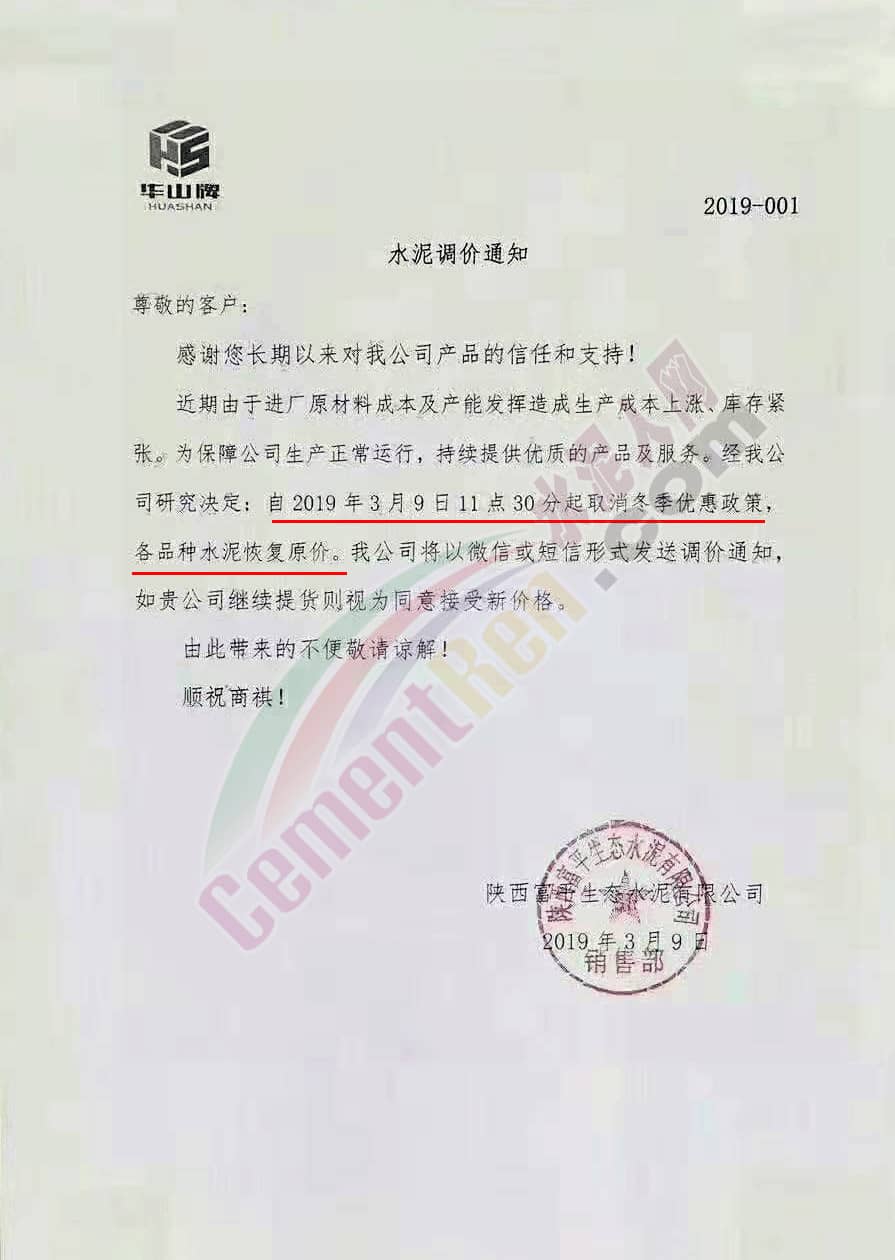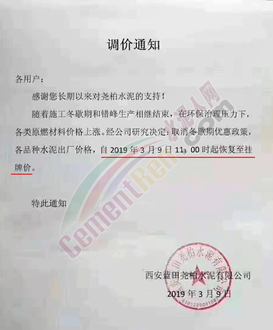 據水泥人網通訊員反饋,近兩日來,關中地區(qū)多家水泥企業(yè)也分別通知客戶水泥價格上漲20-30元/噸,且多家企業(yè)已恢復至2019年元旦前出廠價格 。企業(yè)調價函如下: