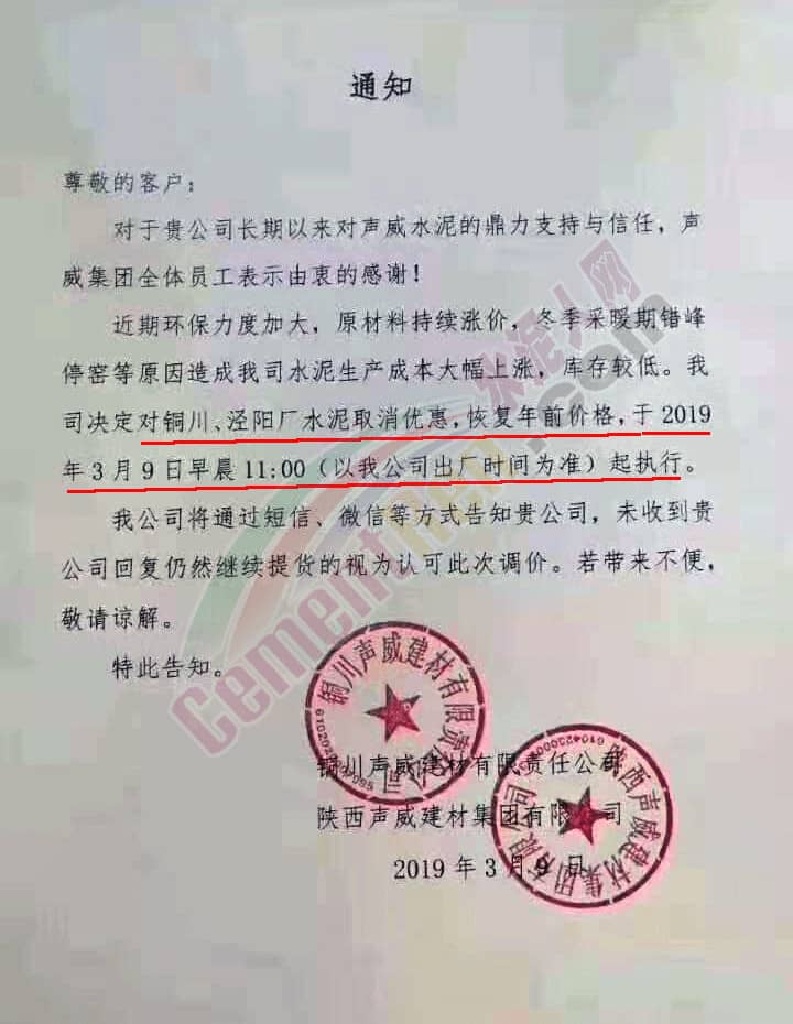 銅川聲威建材有限責任公司(陜西聲威建材集團有限公司)通知稱,近期環(huán)保力度加大,原材料持續(xù)漲價,冬季采暖期錯峰停窯等原因造成企業(yè)水泥生產成本大幅上漲,庫存較低。企業(yè)決定對銅川、涇陽廠水泥取消優(yōu)惠,恢復年前價格,于3月9日起執(zhí)行。
