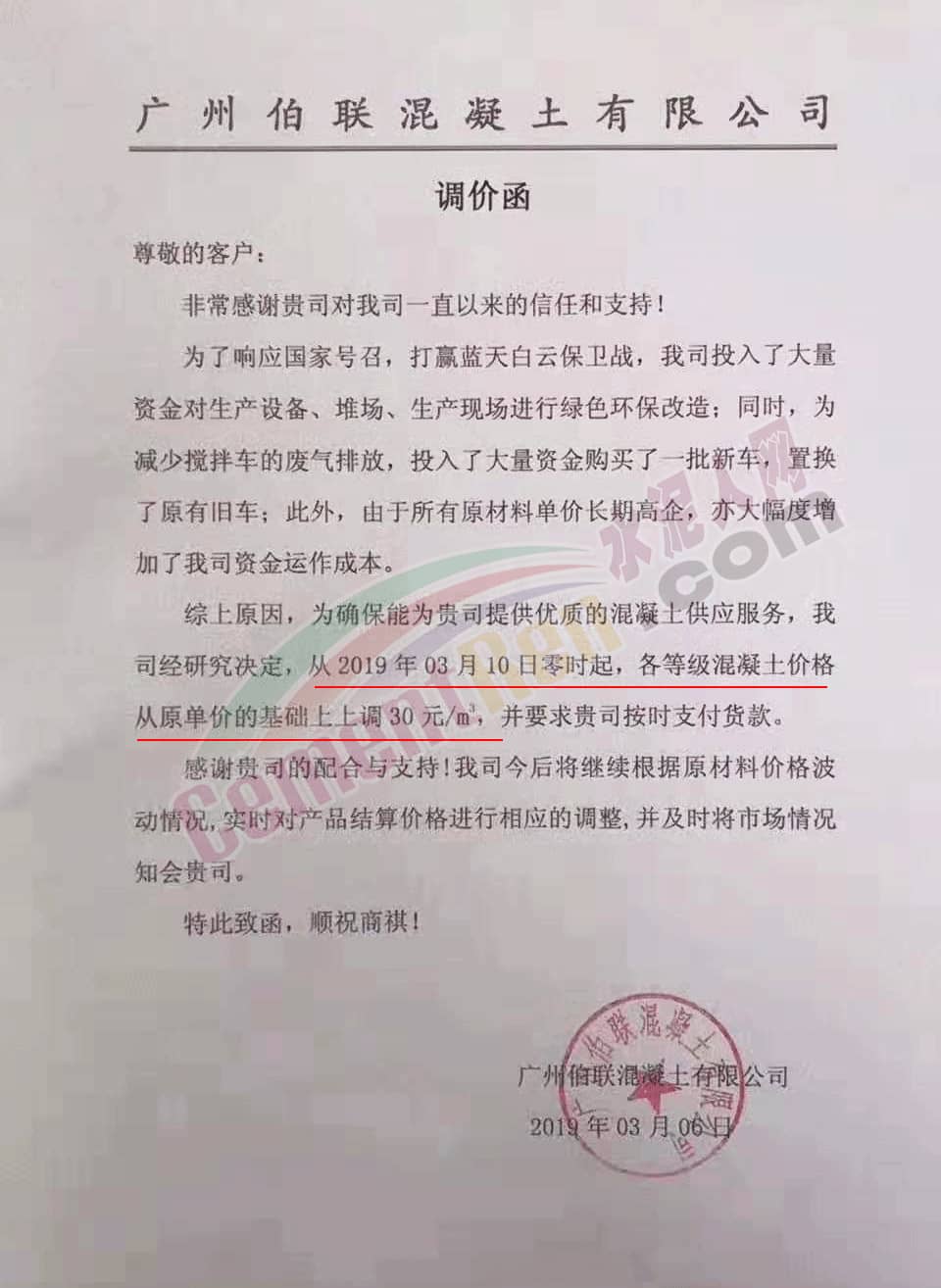 廣州伯聯混凝土有限公司調價函稱,為了響應國家號召,打贏藍天白云保衛(wèi)戰(zhàn),公司投入了大量資金對生產設備、堆場、生產現場進行綠色環(huán)保改造;同時,為減少攪拌車的廢氣排 放,投入了大量資金購買了一批新車,置換了原有舊車;此外,由于所有原材料單價長期高企,亦大幅增加了公司資金運作成本。