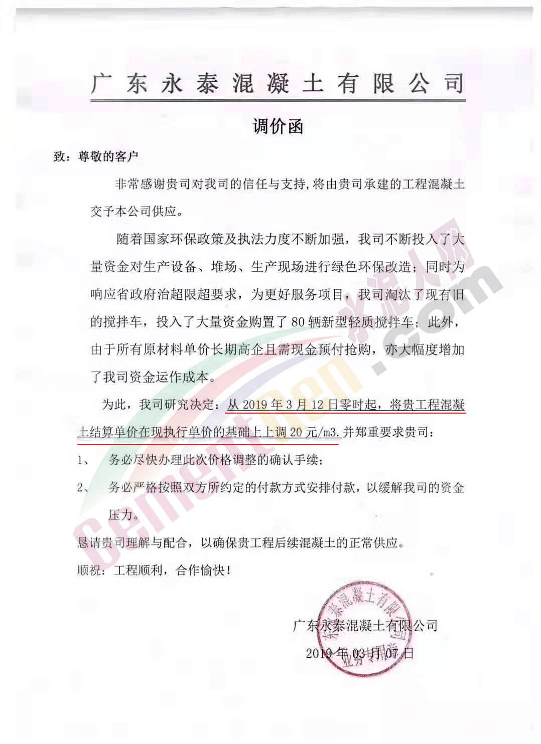 廣東永泰混凝土有限公司調價通知,從3月12日零時起,上調20元/立方米。