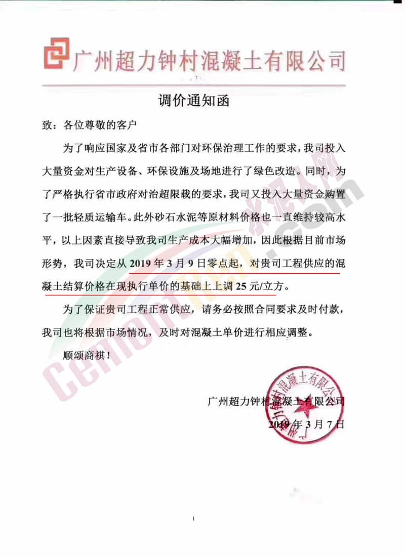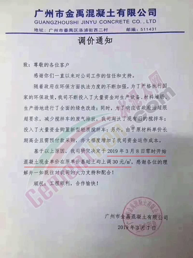廣州市金禹混凝土有限公司調價通知,3月8日零時起上調30元/立方米。