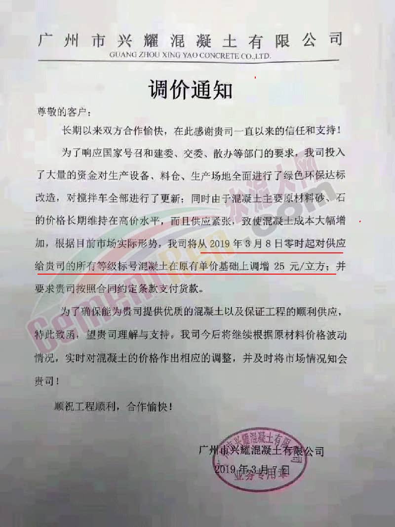 廣州市興耀混凝土有限公司調價通知,3月8日0時 起上調25元/立方米。