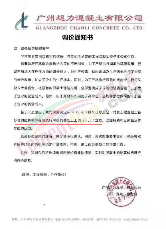 廣州超力鐘村混凝土有限公司調價通知,從3月9日零點起,上調25元/立方米。