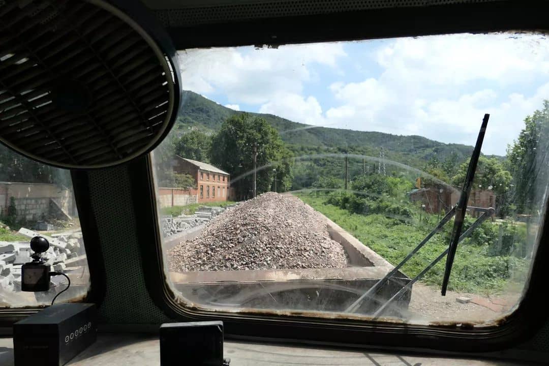 裝載貨物的車(chē)廂是俗稱“老K車(chē)”的自卸翻斗車(chē),車(chē)廂上部的料斗在安裝于車(chē)底架兩側(cè)的氣缸的作用下可以向一側(cè)翻起,卸下石料。這些“老K車(chē)”9節(jié)為一組,掛在機(jī)車(chē)后面,將從湖山礦開(kāi)采出的石料運(yùn)往龍?zhí)稄S。