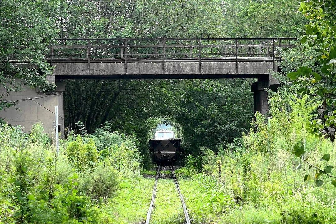 從礦區(qū)車(chē)站出發(fā)約1公里,下穿京滬高鐵,再沿線路向北走約2公里,就可以到達(dá)有名的“南京大十字”——中國(guó)水泥廠的762毫米非電化窄軌鐵路在此與江南水泥廠的900毫米電氣化窄軌鐵路十字立體交叉。中國(guó)廠專(zhuān)用線在下,江南廠專(zhuān)用線在上,這樣在主用準(zhǔn)軌的國(guó)度里出現(xiàn)兩種不同軌距的窄軌十字交叉的景象舉世鮮有??上У氖?,這次探訪中筆者并沒(méi)能捕捉到兩種窄軌列車(chē)在此交會(huì)的情景,有些遺憾。