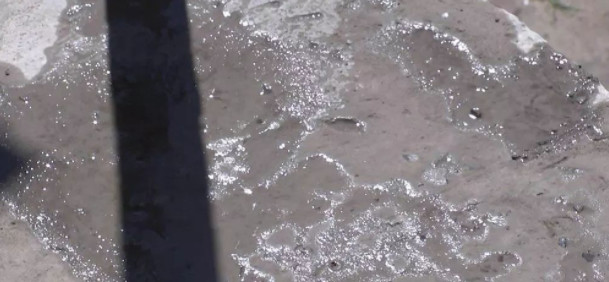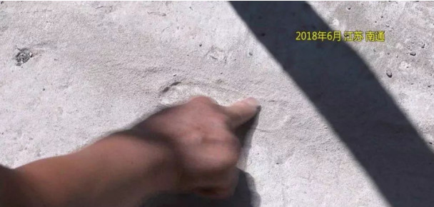 在現(xiàn)場,尹先生用手指在水泥地面上左右擦動,擦動的地方不僅會凹進(jìn)去,還有小顆粒產(chǎn)生,而澆上水后,水泥地面上冒起了小泡泡。