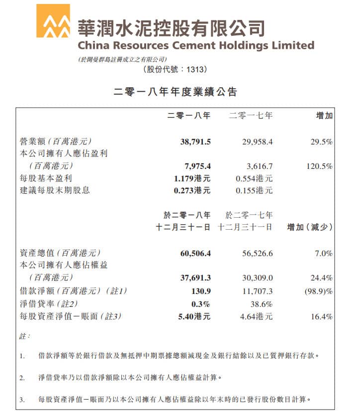 華潤水泥控股(01313.HK)公布,截至2018年12月31日止年度,實現營業(yè)額387.92億港元,同比增加29.5%;毛利154.20億港元,同比增加67.05%,毛利率由去年同期的30.8%增至39.8%;公司擁有人應占盈利79.75億港元,同比增加120.5%;每股基本盈利1.179港元;擬派末期股息每股0.273港元。