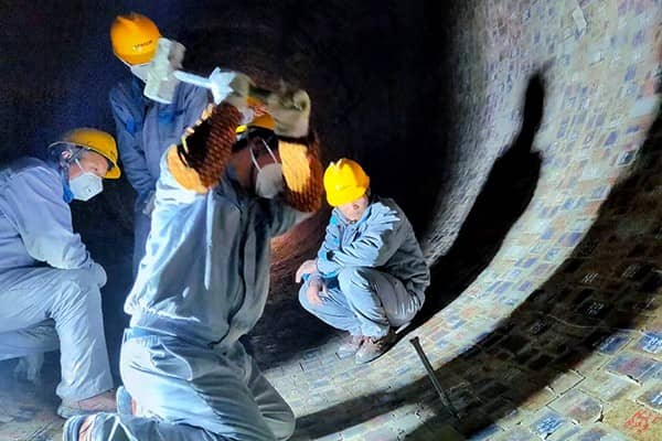 負責窯檢修的工人分批進入窯內(nèi)砌磚。每塊磚的疊放,工人師傅都會用橡皮錘狠狠地敲擊,確保嚴絲合縫。“磚與磚之間不能有縫,否則在窯運轉(zhuǎn)的過程中很有可能發(fā)生掉磚事故”,班長彭高彪說:“在砌完之后,我們會對241環(huán)磚逐個敲擊,遇見松動的地方,會砸進鋼板進行加固。”