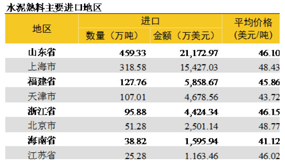 從進口熟料的區(qū)域來看,山東占總進口量的36%,位于長三角區(qū)域的上海、浙江、江蘇合計占35%,華南福建、海南兩省合計占13%。