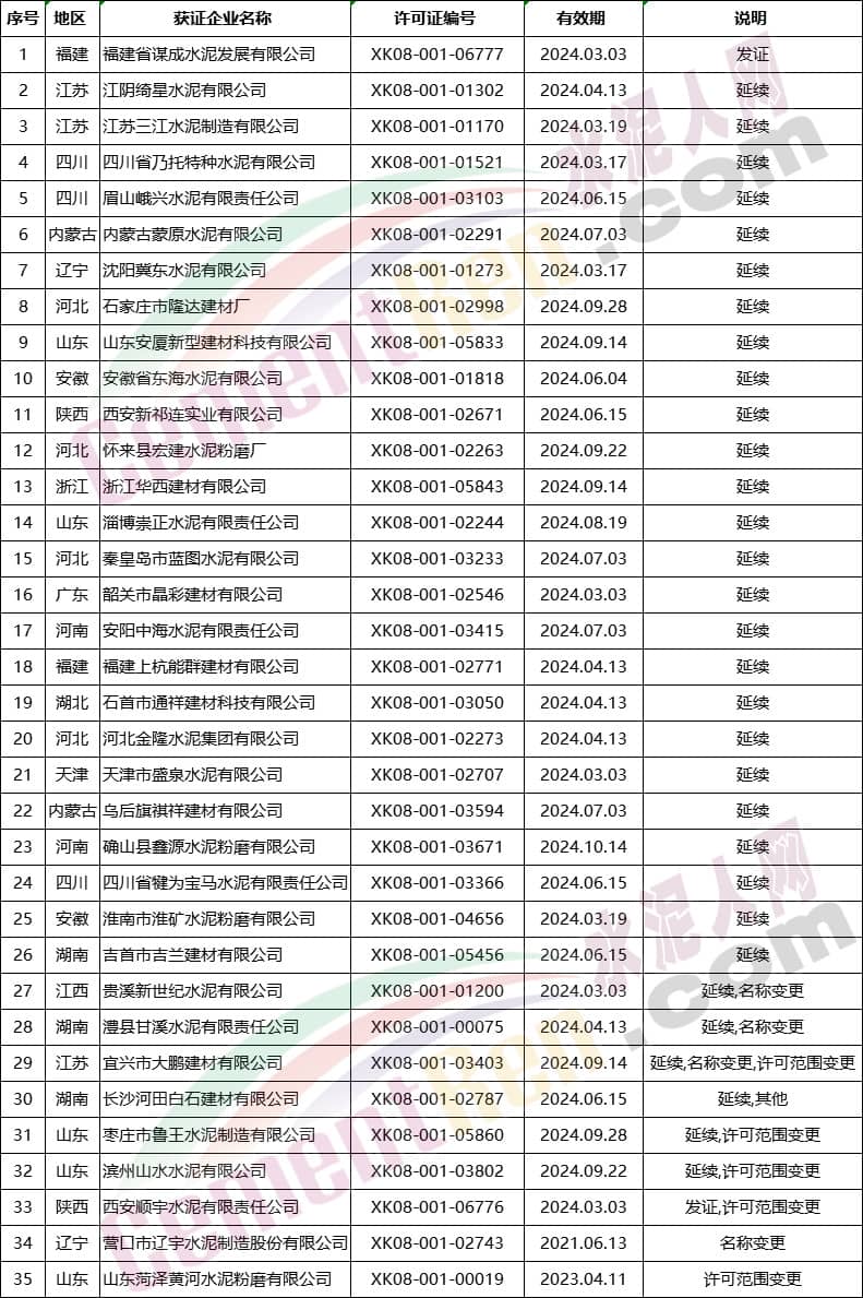 日前,質(zhì)檢總局生產(chǎn)許可證辦公室發(fā)布3月份第一批生產(chǎn)許可證名單,共35個編號。其中新發(fā)證書一個編號,到期延續(xù)25個編號,涉及變更項目的8個編號,另有一個編號為其他項目。詳情如下:
