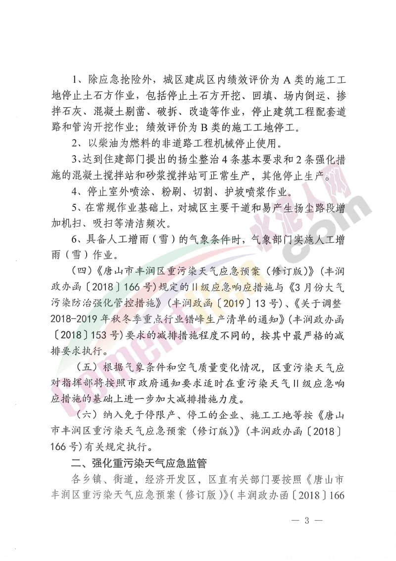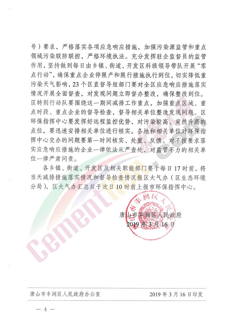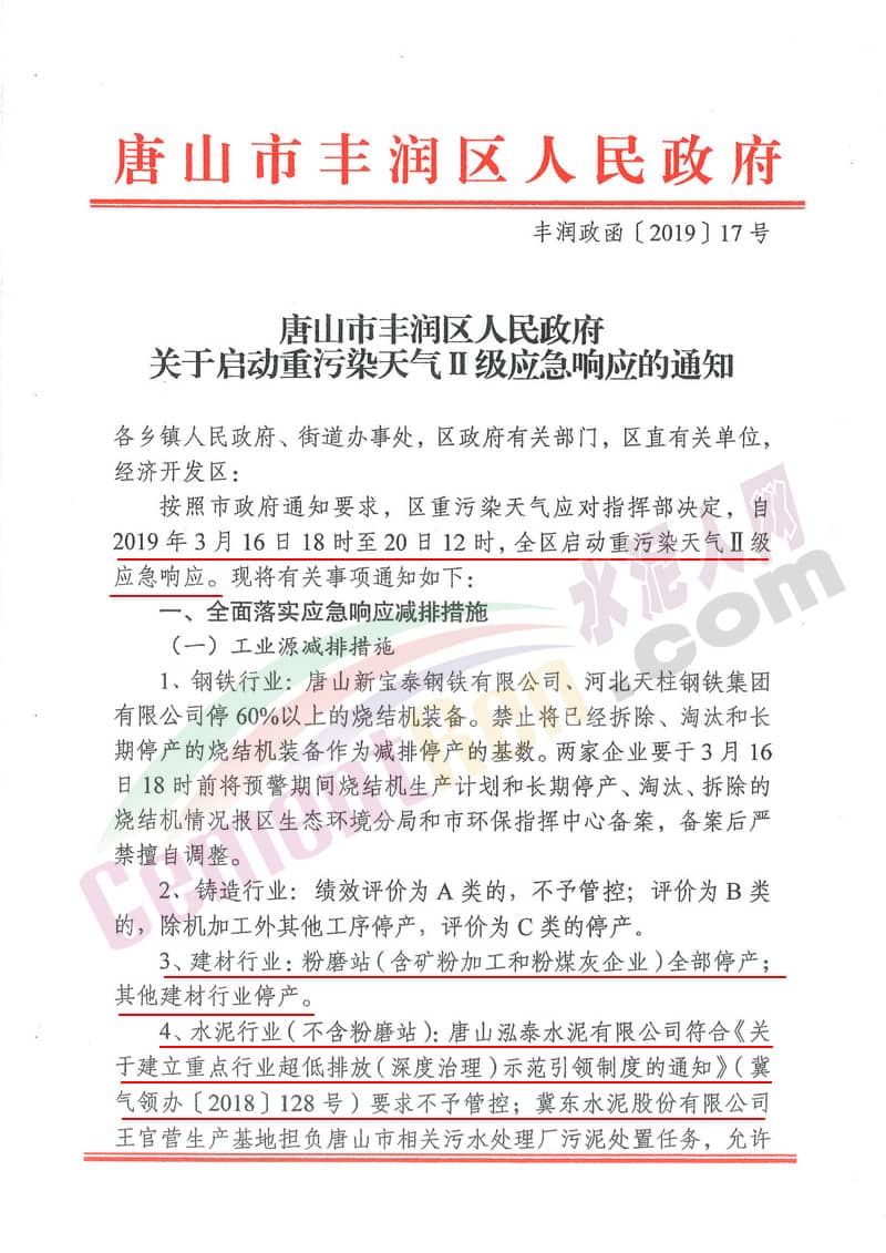據(jù)水泥人網(wǎng)了解,同一日唐山市政府也發(fā)布了相關(guān)通知,通知稱(chēng):按照省大氣辦《關(guān)于啟動(dòng)區(qū)域一和區(qū)域二Ⅱ級(jí)應(yīng)急響應(yīng)的通知》要求,根據(jù)近日氣象擴(kuò)散條件,市重污染天氣應(yīng)對(duì)指揮部決定自2019年3月16日18時(shí)至20日12時(shí),全市啟動(dòng)重污染天氣Ⅱ級(jí)應(yīng)急響應(yīng)。