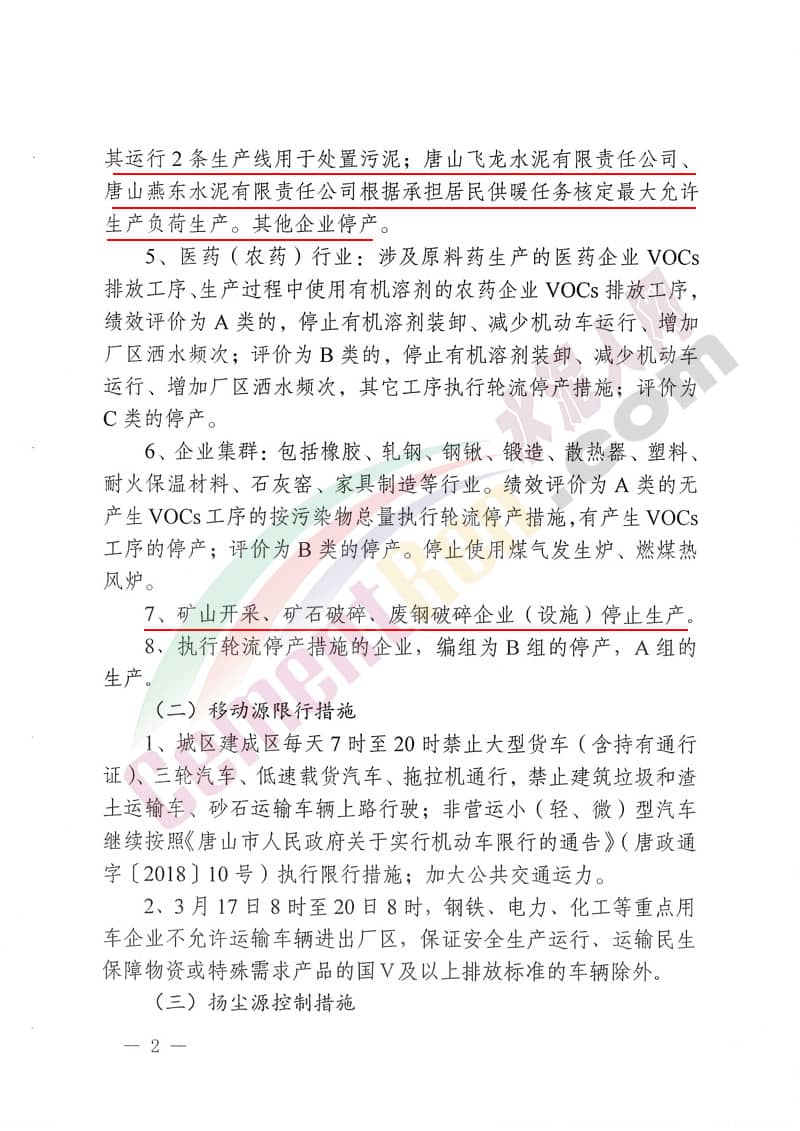 礦山開(kāi)采、礦石破碎企業(yè)(設(shè)施)停止生產(chǎn)。執(zhí)行輪流停產(chǎn)措施的企業(yè),編組為B組的停產(chǎn),A組的生產(chǎn)。