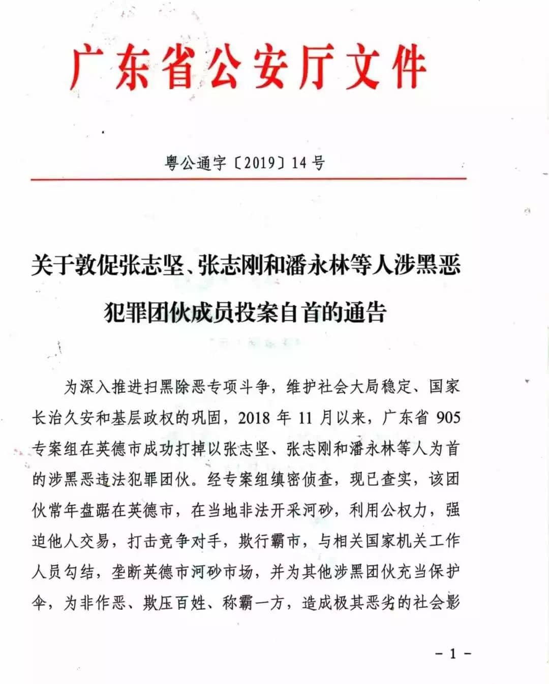 2018年11月15日,專案警示教育暨敦促投案自首動員大會在英德市公安局召開,同時在英德市張貼由省公安廳發(fā)布的《關于敦促張志堅、張志剛和潘永林等人涉黑惡違法犯罪團伙成員投案自首的通告》,深入群眾開展宣傳攻勢,形成強大的震懾。動員會前后,清遠市公安系統(tǒng)5名干警和1名監(jiān)獄系統(tǒng)民警相繼向組織主動投案。