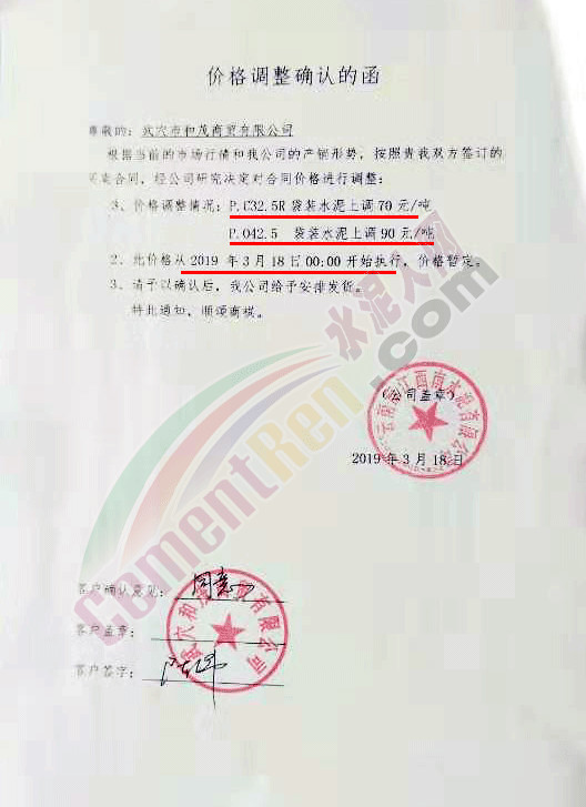 云南麗江西南水泥同期發(fā)給外圍經(jīng)銷(xiāo)商的價(jià)格調(diào)整確認(rèn)函稱(chēng),根據(jù)當(dāng)前的市場(chǎng)行情和公司的產(chǎn)銷(xiāo)形勢(shì)。經(jīng)公司研究決定從2019年3月18日00.00開(kāi)始對(duì)合同價(jià)格進(jìn)行調(diào)整:其中P.C32.5R 袋裝水泥上調(diào)70元/噸。P.042.5 袋裝水泥上調(diào)90元/噸。