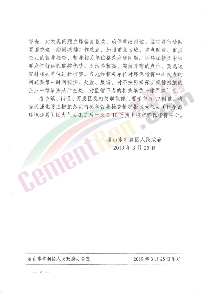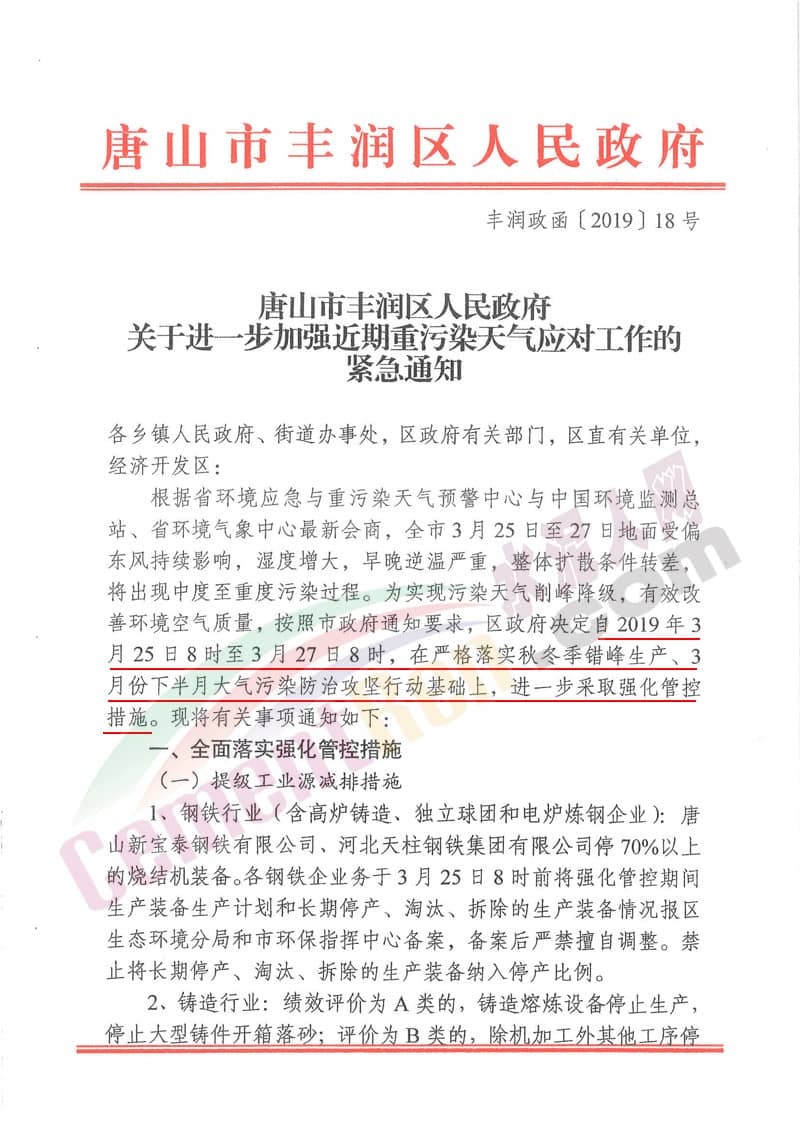 水泥人網消息:昨日(3月25日)唐山市豐潤區(qū)人民政府發(fā)布豐潤政函【2019】18號文件《關于進一步加強近期重污染天氣應對工作的緊急通知》稱,3月25日至27日受不利氣候因素影響,將出現(xiàn)中度至重度污染過程,市政府決定自2019年3月25日8時至3月27日8時,在嚴格落實秋冬季錯峰生產、3月份下半月大氣污染防治攻堅行動措施的基礎上,進一步采取強化管控措施。
