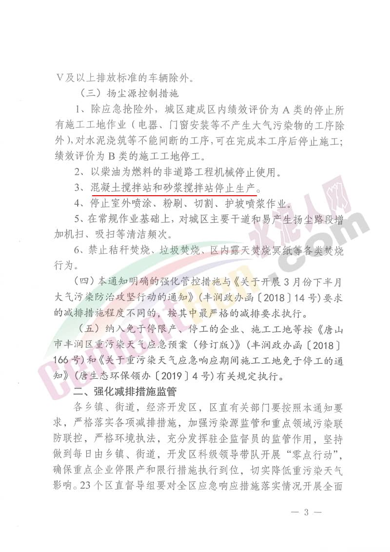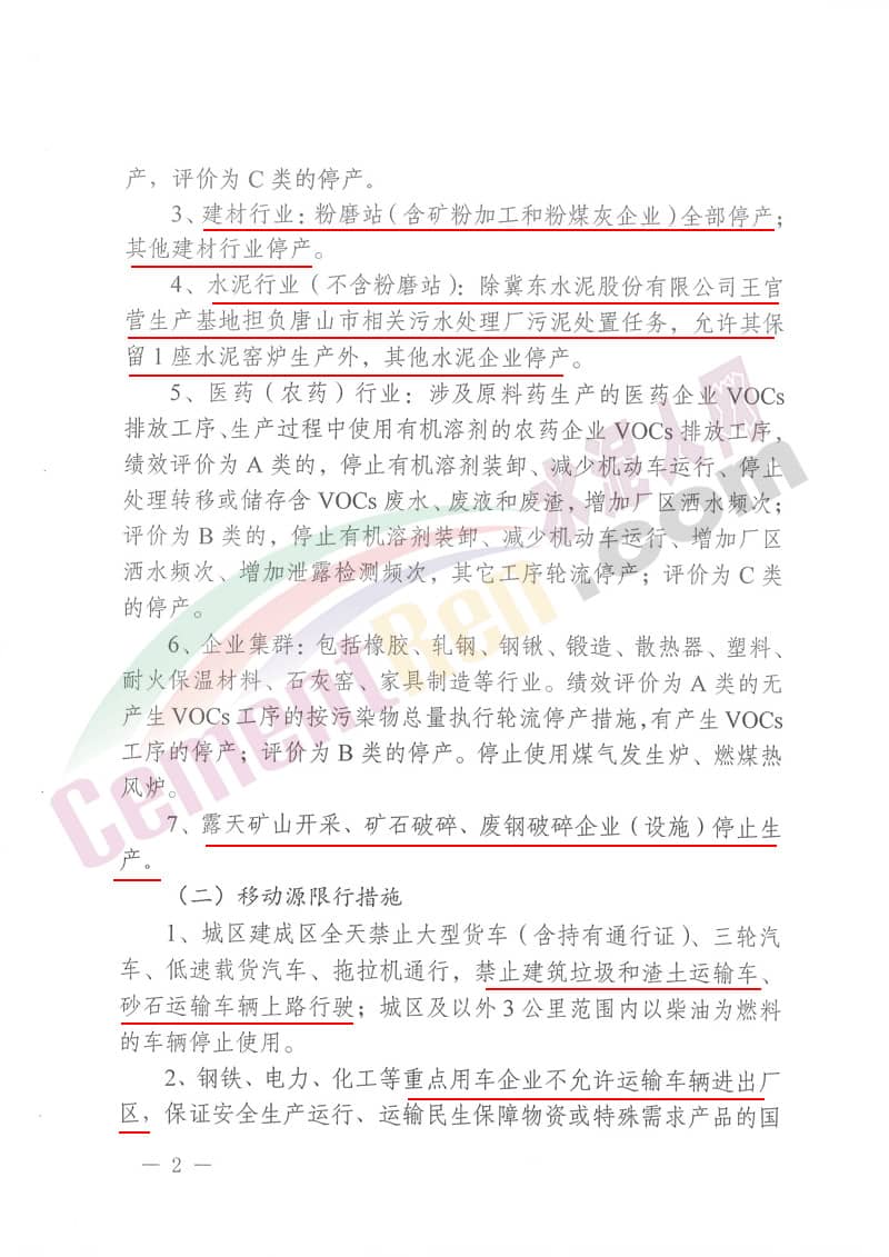 建材行業(yè):粉磨站(含 礦粉加工和粉煤灰企業(yè))全部停產;其他建材行業(yè)停產;水泥行業(yè)(不含粉磨站):除冀東水泥股份有限公司王官營生產基地擔負唐山市相關污水處理廠污泥處置任務,允許其保留1座窯爐生產外,其他水泥企業(yè)停產;礦山開采等:露天礦山開采、礦石破碎、廢鋼破碎企業(yè)(設施)停止生產;移動源方面:禁止建筑垃圾和渣土運輸車、砂石運輸車輛上路行駛 ;重點用車企業(yè)不允許運輸車輛進出廠區(qū);揚塵源控制措施方面,混凝土攪拌站和砂漿攪拌站停止生產。通知文件原文如下: