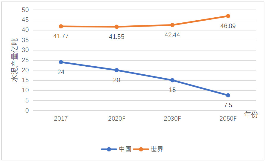 2030年和2050年,世界水泥總產(chǎn)量將分別為42.5億噸和46.9億噸,2050年比2017年增加12.2%;中國則分別為15億噸和7.5億噸,相應(yīng)地減少68.8%。因為這段時期在全世界范圍內(nèi),水泥需求仍處于緩慢上升階段,但是中國自2018年開始,水泥需求將逐漸趨于下行。
