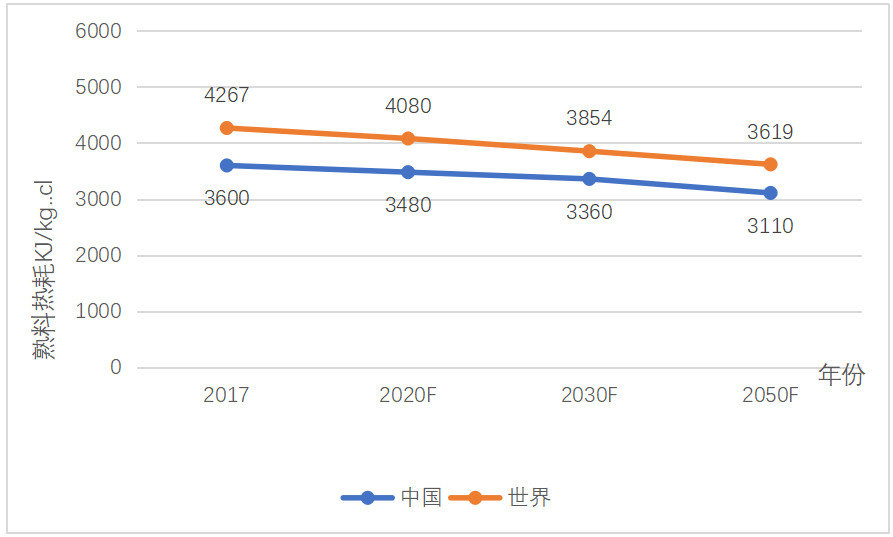 kJ/kg,2050年比2017年降低15.2%; 中國則分別為3360 kJ/kg和3110 kJ/kg,,相應(yīng)地降低13.6%。同樣2050年,中國的熟料單位熱耗比世界均值先進(jìn)不少,低13.9%,主要是熟料燒成技術(shù)裝備已處于領(lǐng)先水平。