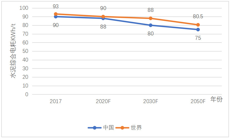 2013年和2050年,世界水泥綜合電耗分別為88 kWh/t和80.5 kWh/t,2050年比2017年降低13.4%; 中國則分別為80 kWh/t和75 kWh/t,2050年比2017年降低16.7%。同樣水泥綜合電耗中國也處于世界領(lǐng)先水平。