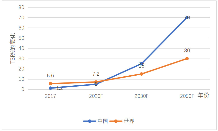 2030年和2050年,世界TSR分別為15% 和30%,2050年比2017年增加24.4個百分點; 中國的TSR分別為25% 和70%, 2050年比2017年增加68.8個百分點。TSR比世界均值先進(jìn)得多。