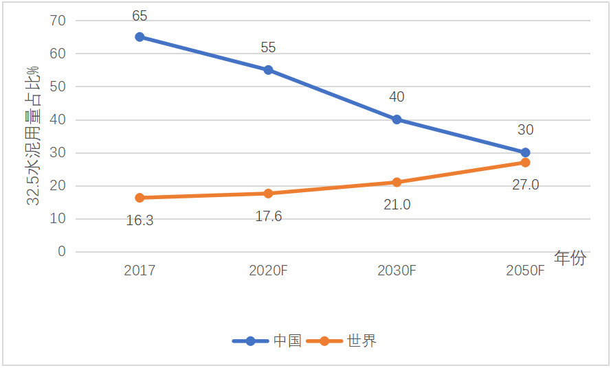2030年和2050年,世界32.5水泥用量占比分別為21%和27%,2050年比2017年上升10.7個百分點;中國則分別為40%和30%,相應(yīng)的下降35個百分點。這是中國逐步向國際先進(jìn)看齊的結(jié)果。