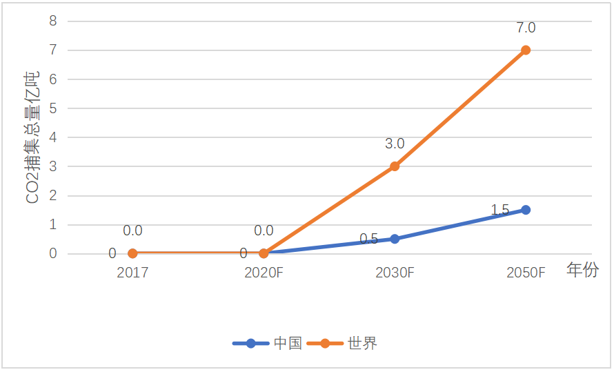 2030年和2050年,世界水泥工業(yè)二氧化碳捕集總量分別為3噸和7噸,中國則分別為0.5噸和1.5噸。兩者都是臨近2030年才開始規(guī)模化商業(yè)化運行的,但中國發(fā)展較快,應(yīng)用較廣。