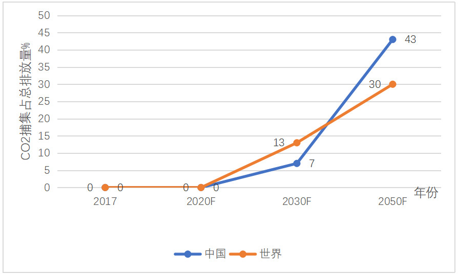 2030年和2050年,世界水泥工業(yè)二氧化碳捕集量占總排放量的比例,分別為13%和30%,中國分別為7%和43%。同樣,中國比世界均值先進(jìn)得多。