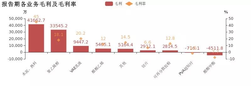 從業(yè)務結構來看,“聚乙烯醇”是企業(yè)營業(yè)收入的主要來源。具體而言, “聚乙烯醇”營業(yè)收入為18.6億,營收占比為32.3%。“水泥、熟料”營業(yè)收入為9.3億,營收占比為16.1%。“醋酸甲酯”營業(yè)收入為5.8億,營收占比為10.2%。