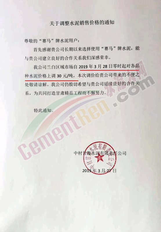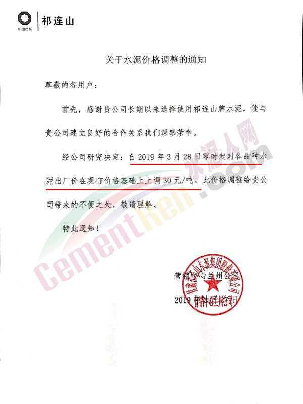 甘肅祁連山水泥集團(tuán)股份有限公司營(yíng)銷中心蘭州公司調(diào)價(jià)通知稱,自今日(3月28日)零時(shí)起對(duì)各品種水泥出廠價(jià)在現(xiàn)有價(jià)格基礎(chǔ)上上調(diào)30元/噸。