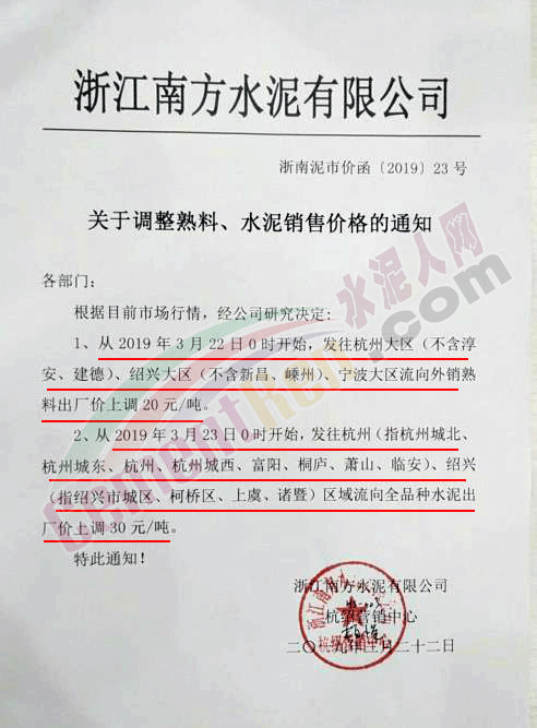 2、從3月23日0時(shí)開始,發(fā)往杭州(指杭州城北、杭州城東、杭州、杭州城西、富陽、桐廬、蕭山、臨安)、紹興(指紹興市城區(qū)、柯橋區(qū)、上虞、諸暨)區(qū)域流向全品種水泥出廠價(jià)上調(diào)30元/噸。